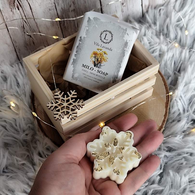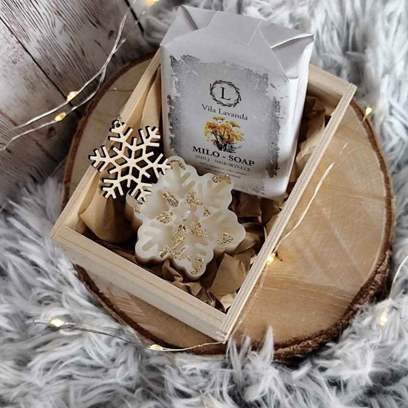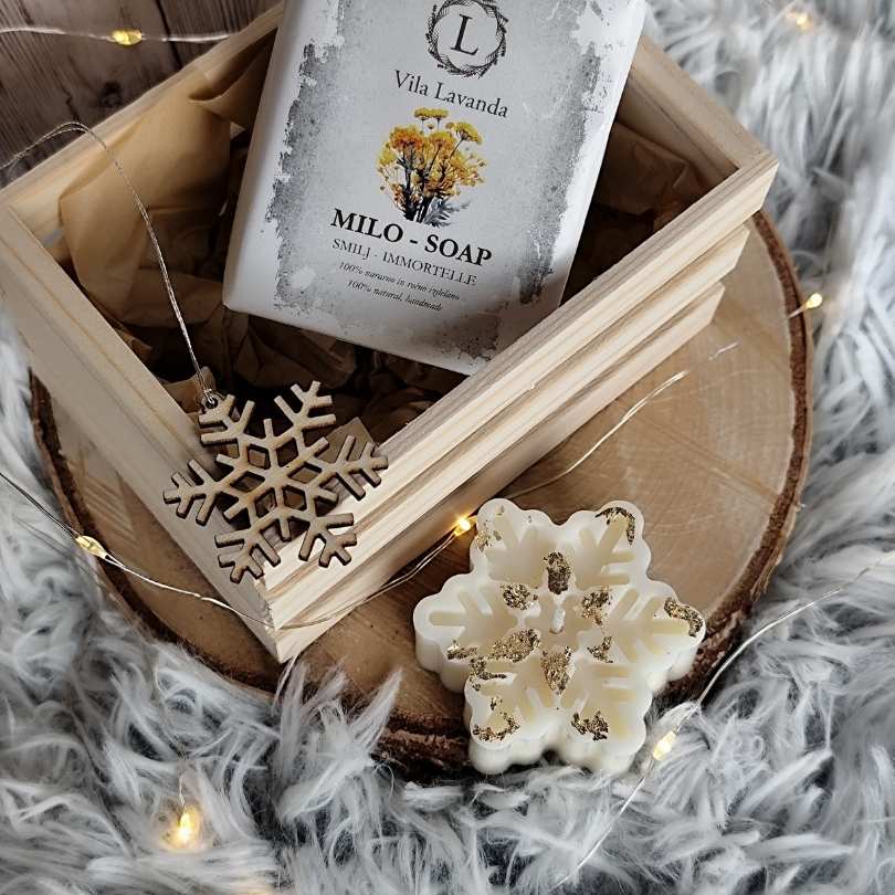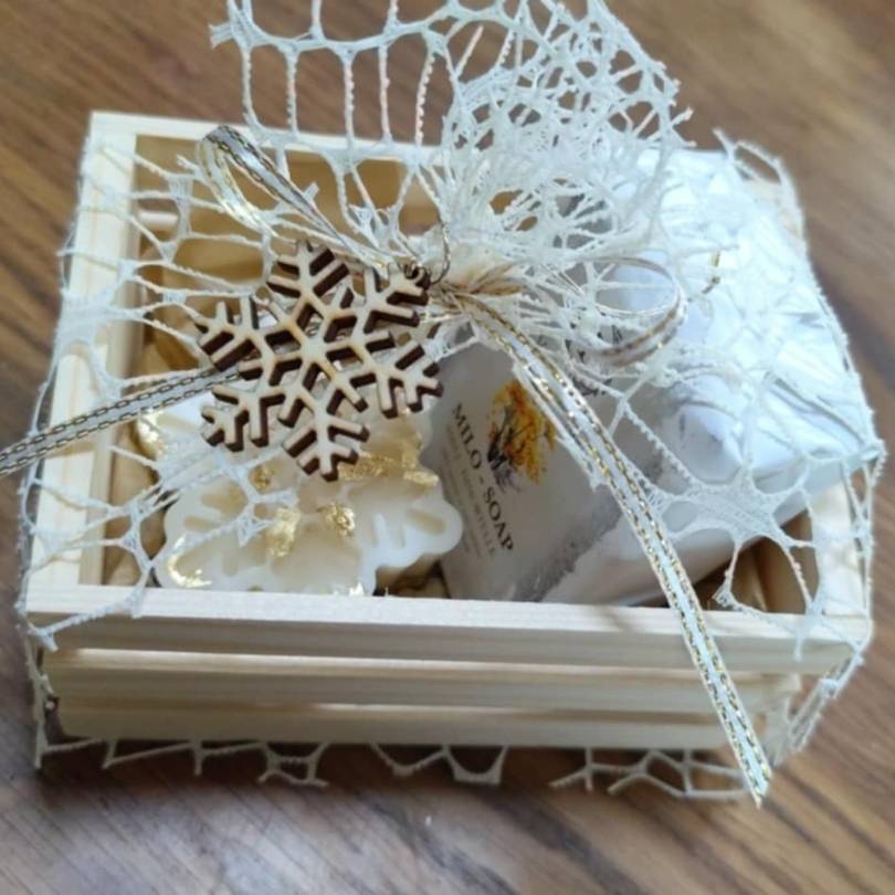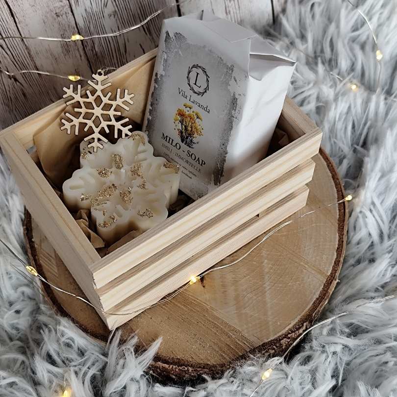 Ročno izdelan praznični darilni zabojček z naravnim milom, dišečo svečko in lesenim okraskom