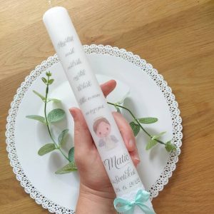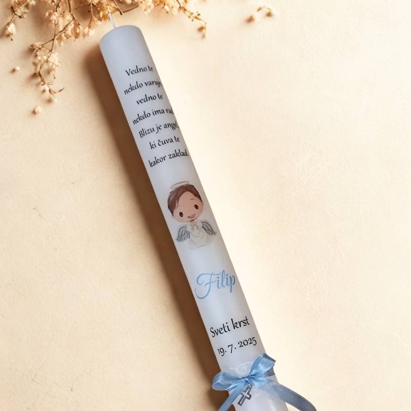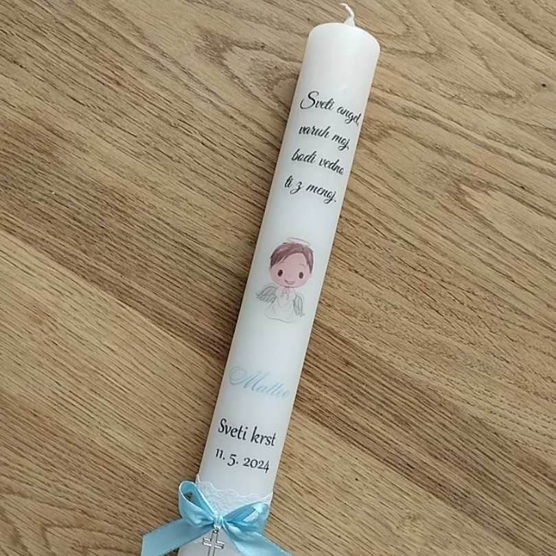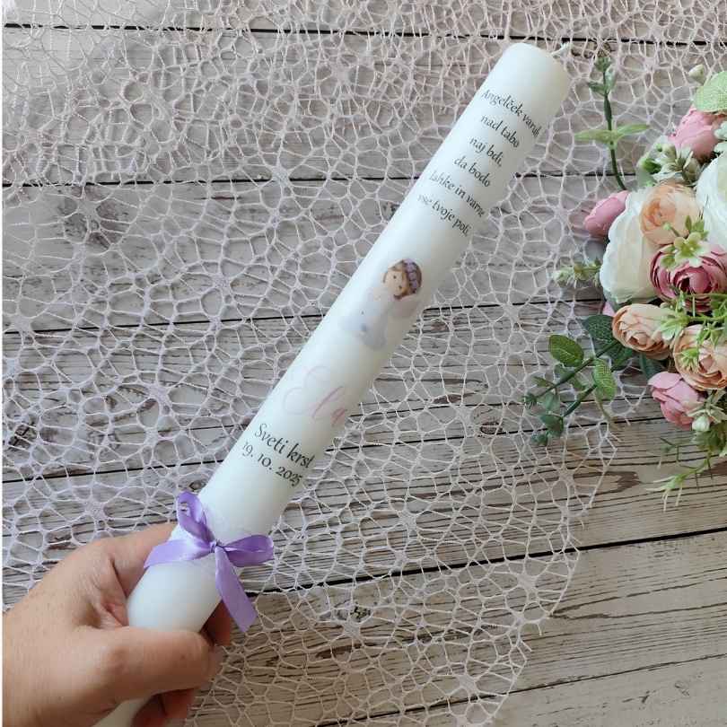 Klasična krstna sveča je dolga in ozka, na sveči je misel, izbrani motiv angelčka ter ime krščenca ter datum krsta.