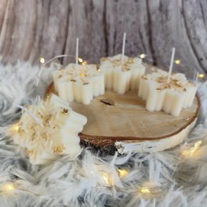 Vnesi čar praznikov v svoj dom kompletom ročno izdelanih svečk v obliki snežinke z zlatimi lističi.